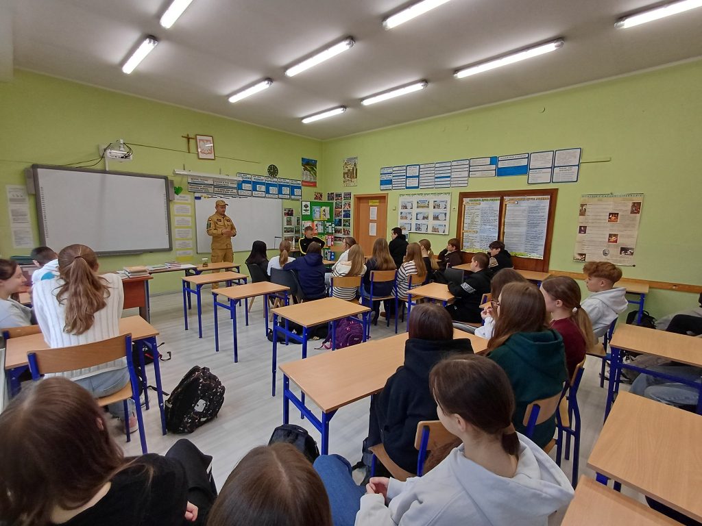 Zajęcia poprowadził p. Artur Banatkiewicz – Strażak, który w ciekawy i praktyczny sposób przypomniał Uczniom, jak ważne jest noszenie odblasków oraz zachowanie ostrożności na drodze by uniknąć wypadku.